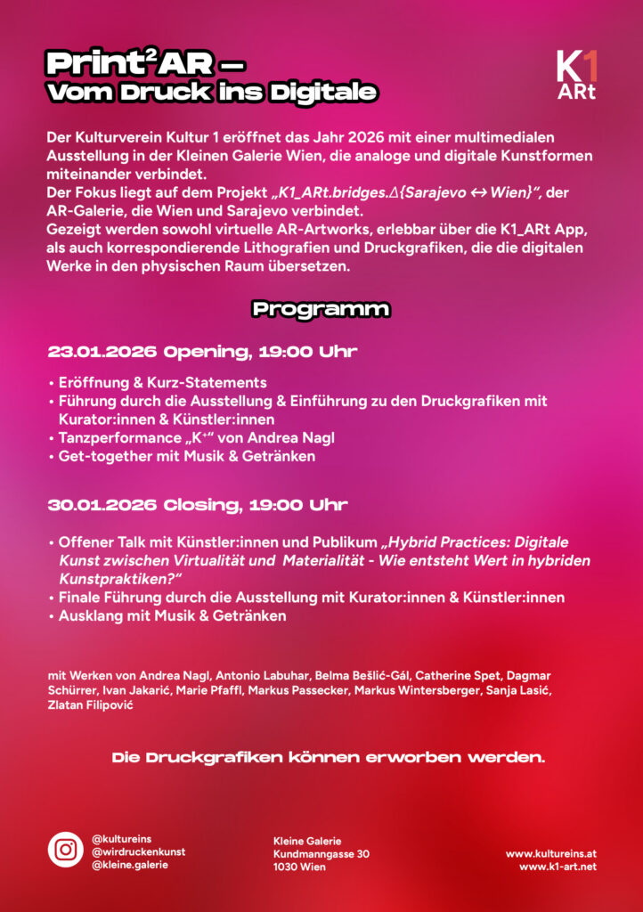 Im Fokus stehen AR-Artworks aus K1_ARt.bridges.Δ{Sarajevo ↔ Vienna}, die öffentliche Räume in Wien und Sarajevo poetisch-politisch neu denken. Ergänzt werden die digitalen Arbeiten durch limitierte, hochwertige Druckgrafiken, die die AR-Werke in den physischen Raum übersetzen, sowie durch Videoprojektionen und 3D-Objekte.