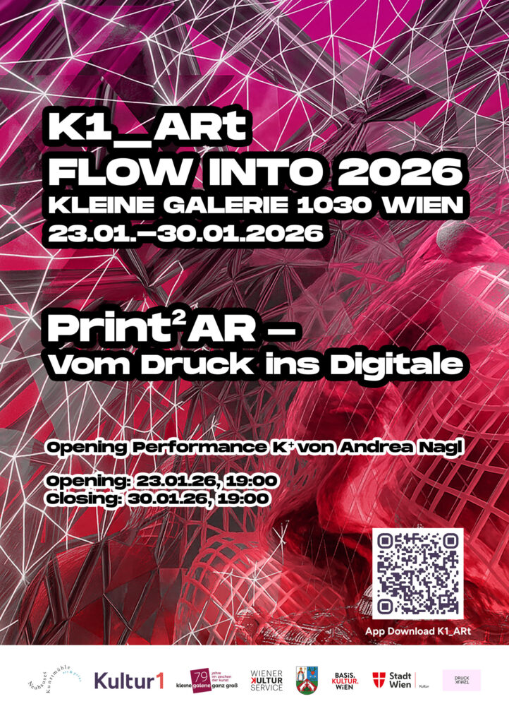 Mit Flow into 2026 eröffnet der Kulturverein Kultur 1 das neue Jahr mit einer multimedialen Ausstellung, die Augmented Reality, Druckgrafik, Performance und Musik miteinander verschränkt und analoge wie digitale Räume verbindet.